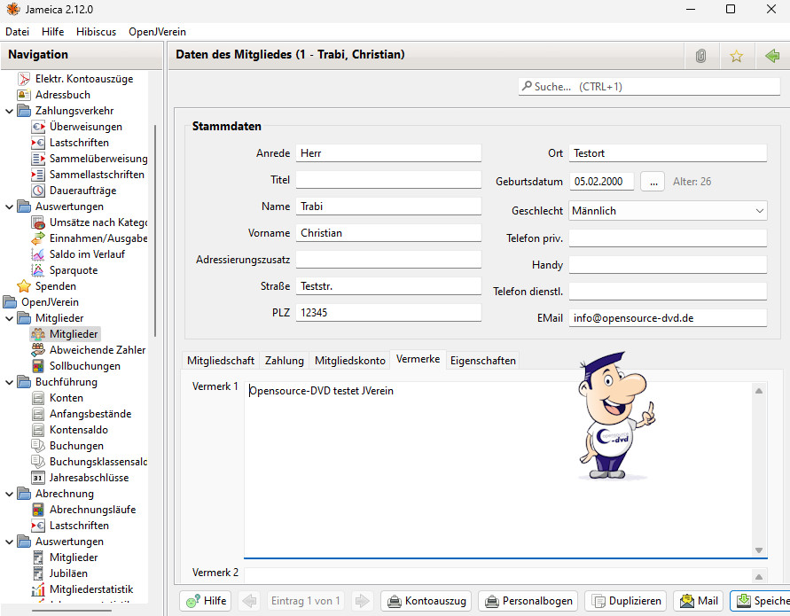 Die Vereinsverwaltung bietet eine komplette Mitgliederverwaltung mit Beitragsverwaltung, Buchführung, Statistikmodule und Onlinebanking. JVerein erfasst neben den persönlichen Daten der Mitglieder auch den Stand der Beitragszahlungen. Es erstellt Rechnungen, Mahnungen und Spendenquittungen und sendet Ihre Mails an Mitglieder. Mitgliederdaten und statistische Auswertungen werden im PDF- oder CSV-Format ausgegeben. ![]()